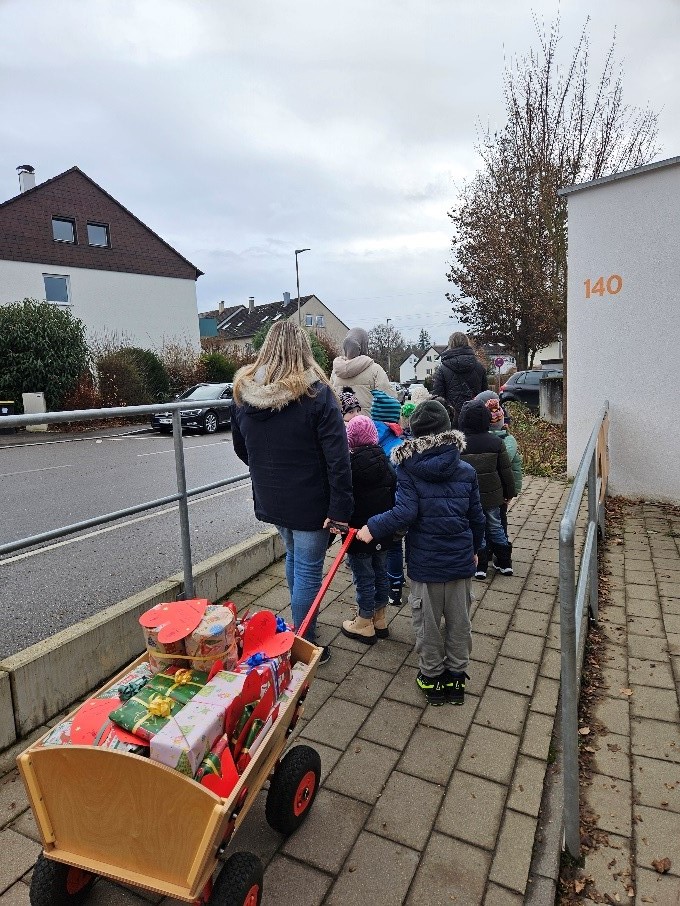 Seit einigen Jahren gibt es bei der Stadt Wendlingen in Zusammenarbeit mit dem HGV Wendlingen die Aktion „Ein Weihnachtsherz für Kinder“. Kinder von Familien, die sich keine großen Geschenke leisten können, haben die Möglichkeit, ihren Weihnachtswunsch im Wert von 20 € auf ein Papierherz zu schreiben und im Rathaus abzugeben. Jeder kann ein Herz abholen, das Geschenk kaufen und schön verpackt ins Rathaus bringen. Dank der großzügigen Spenden die an St. Martin zusammengekommen sind, war es dem kath. Kinder- und Familienzentrum Am Berg möglich 20 Herzenswünsche zu erfüllen. Gemeinsam mit den Kindern wurden die liebevoll verpackten Geschenke zum Rathaus gebracht. An Weihnachten konnten so die Wünsche der Kinder in Erfüllung gehen und wir hoffen, dass es viele strahlende Kinderaugen beim Auspacken der Geschenke gab.