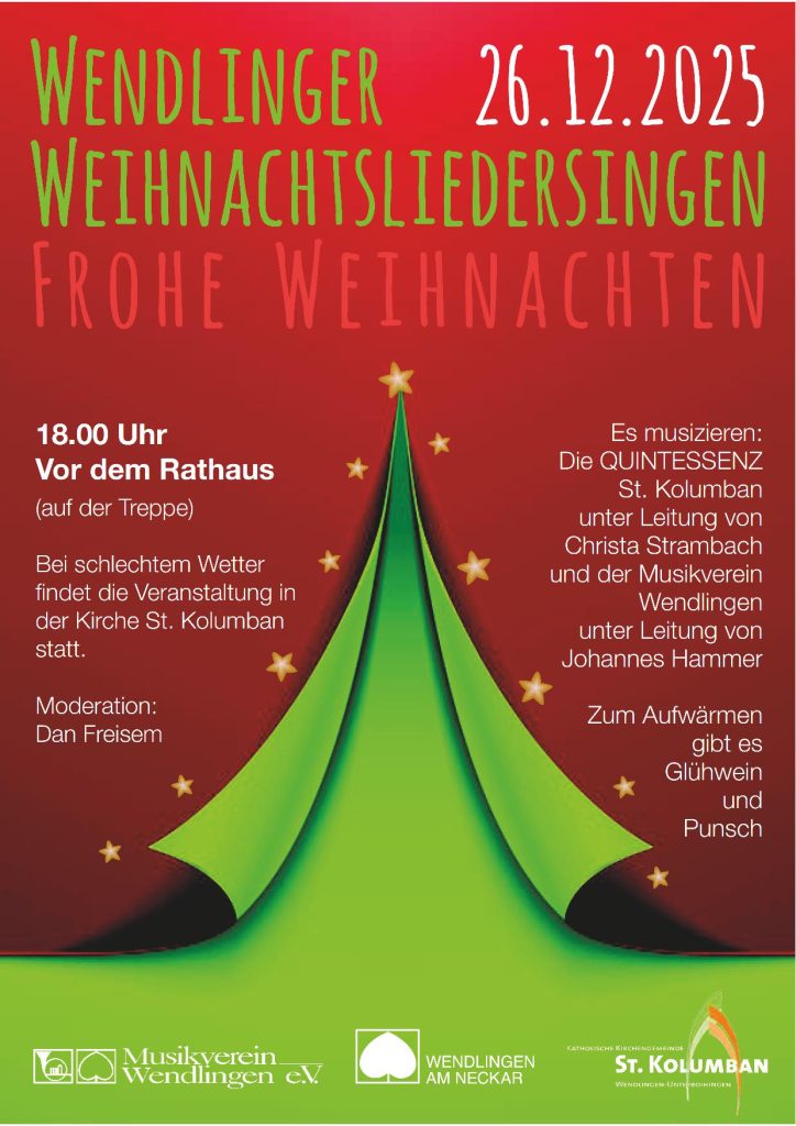 Eine langjährig gepflegte Tradition ist das Weihnachtsliedersingen am 2. Weihnachtsfeiertag auf der Wendlinger Rathaustreppe. Am Freitag, 26. Dezember, 18 Uhr, musizieren die QUINTESSENZ St. Kolumban unter Leitung von Christa Strambach und der Musikverein Wendlingen unter Leitung von Johannes Hammer. Dan Freisem übernimmt die Moderation. Mit Klängen von Chor und Blasorchester, mit gemeinsamem Singen, Punsch und Glühwein – ein würdig-feierlicher Beschluss der Weihnachtsfeiertage. Bei schlechtem Wetter findet das Weihnachtsliedersingen in der Kolumbankirche statt.