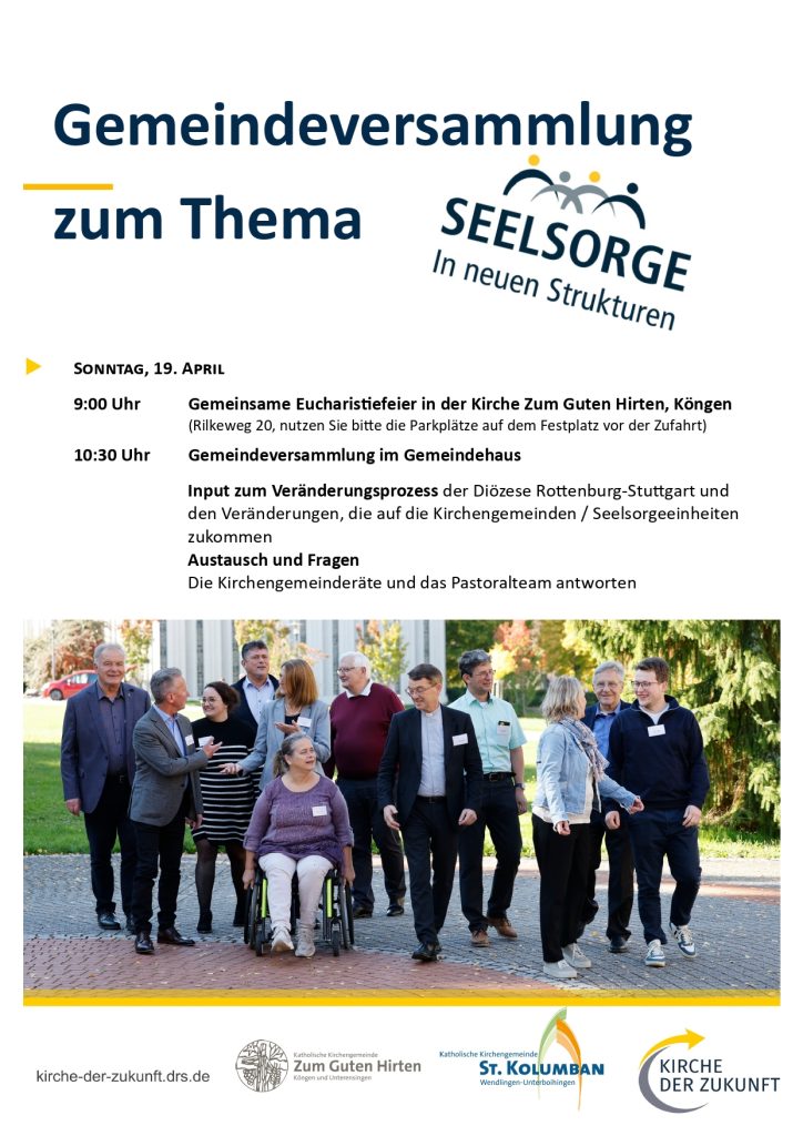 Bei einer gemeinsamen Gemeindeversammlung für die Seelsorgeeinheit am Sonntag, 19. April 2026 um 10:30 Uhr im Gemeindehaus in Köngen wollen wir über die Gründe, die Rahmenbedingungen und die daraus resultierenden Überlegungen informieren und ins Gespräch kommen. Bitte merken Sie sich den Termin jetzt schon in Ihrem Kalender vor!