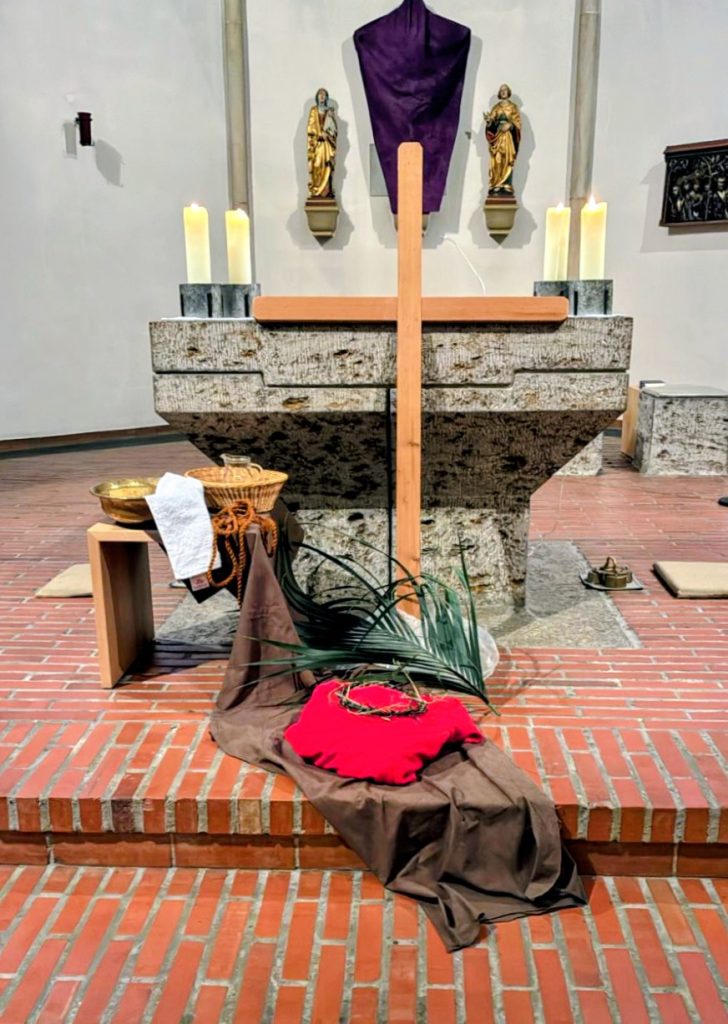 Zum Auftakt der Karwoche haben die Chorkinder des Jugendchors die Gottesdienste in St. Kolumban und in der Dreifaltigkeitskirche mitgestaltet. Zum „Hosianna, Hosianna in der Höh“ winkten selbst gebundene Palmzweige. In einer Prozession, hin zur Kirche, wurde Jesus als Retter und König bejubelt. Wie die Geschichte Jesu damals in Jerusalem weiterging, wurde von den Chorkindern veranschaulicht. Wiederholt erklang der Liedruf: „Den Weg, den wollen wir gehen, den unser Herr Jesu Christ, gewaltlos und voller Liebe, für uns gegangen ist.“ Palmzweig, Brot und Wein, Strick, Wasserschale, roter Mantel, Dornenkrone und Kreuz wurden dabei symbolisch am Altar niedergelegt.