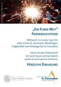Am Heiligen Abend gibt es um 14:30 Uhr in der St. Kolumban-Kirche in Wendlingen eine Krippenfeier mit Krippenspiel. Traditionell spielen dabei die Kommunionkinder mit. Wir würden uns sehr freuen, wenn wir in diesem Jahr wieder an diese schöne Tradition anknüpfen könnten und Ihre Kinder Lust und Zeit hätten, dabei zu sein. Gerne dürfen auch die jüngeren Geschwister mitkommen.