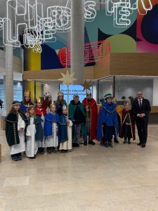 Unsere diesjährige Sternsingeraktion fand am 08.01.2026 einen ganz besonderen Abschluss, denn unsere Wendlinger Königinnen und Könige wurden ins Landratsamt nach Esslingen eingeladen. Der seit 01.10.2024 amtierende Landrat, Herr Marcel Musolf (Freie Wähler), empfing neben unserer Gruppe aus 8 Sternsinger*innen auch noch eine weitere Gruppe aus Erkenbrechtsweiler. Gemeinsam durften die beiden Gruppen Lieder singen, ihre Sprüche aufsagen und den Segen am Haupteingang des neuen Landratsamt Gebäudes anbringen. Anschließend wurden alle Gäste mit Brezeln und Getränken versorgt und es ergaben sich spannende Gespräche. Herr Musolf tauschte sich ausgiebig mit den Kindern aus und bedankte sich recht herzlich bei allen Teilnehmenden, die in den ersten Tagen des neuen Jahres so fleißig unterwegs waren, um möglichst viele Spendengelder zu sammeln. Er betonte unter anderem, wie wichtig es sei, derartige Hilfsprojekte zu unterstützen und zeigte sich sehr dankbar, was die Spendenbereitschaft der Bevölkerung angeht. Nach dem gemütlichen Ausklang brachte uns Steffen von der Wendlinger Feuerwehr mit seinem Bus wieder zurück nach Wendlingen. Dass er bereit war, unsere Gruppe zu fahren und den Nachmittag zu begleiten, war uns eine enorme Hilfe und hat die Organisation wesentlich vereinfacht – vielen herzlichen Dank dafür. Mit unserem Besuch beim Landrat und dem exklusiven Fahrdienst fand unsere diesjährige Aktion einen schönen, erfolgreichen und vor allem besonderen Abschluss.